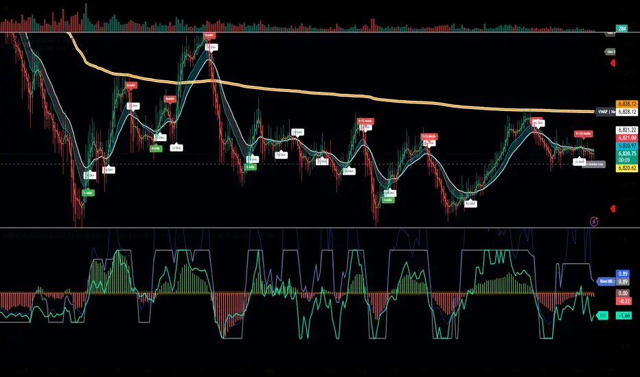 The right-side VWAP label summarizes everything in one place: trend state, price distance from VWAP (percentage), and slope strength with direction arrows, allowing quick assessment without clutter. Practically, VWAP is used as a fair-value anchor and intraday control reference—price holding above a rising VWAP supports continuation, price below a falling VWAP supports downside pressure, and flat VWAP conditions warn of rotation or chop rather than trend.