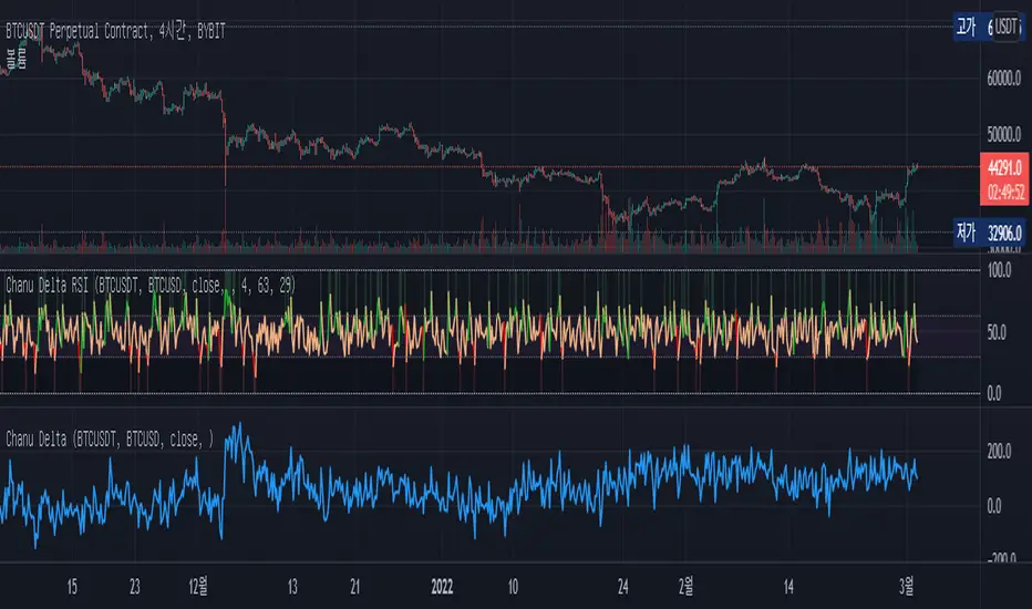 This Chanu Delta RSI indicates the strength of the Bitcoin market. The problem with the previous Chanu Delta Indicator was that it was simply based on the price difference between the two Bitcoin markets, so there was no universality. However, this new Chanu Delta RSI solves the problem by introducing an RSI that compares the price difference trend.