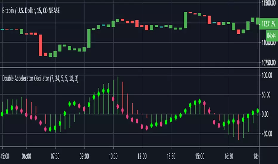 This script plots 2 accelerators rather than 1. Users can define the lengths of the fast and slow SMA's used in the Awesome Oscillator calculation by adjusting the options in the input menu.