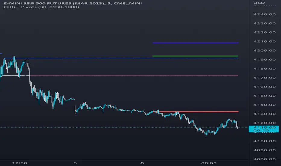 This script is for a combination of two indicators: an Opening Range Breakout (ORB) indicator and a daily/weekly high/low pivot indicator. The ORB indicator displays the opening range (the high and low of the first X minutes of the trading day, where X is a user-defined parameter) as two lines on the chart. If the price closes above the ORB high, the script triggers an alert with the message "Price has broken above the opening range." Similarly, if the price closes below the ORB low, the script triggers an alert with the message "Price has broken below the opening range."