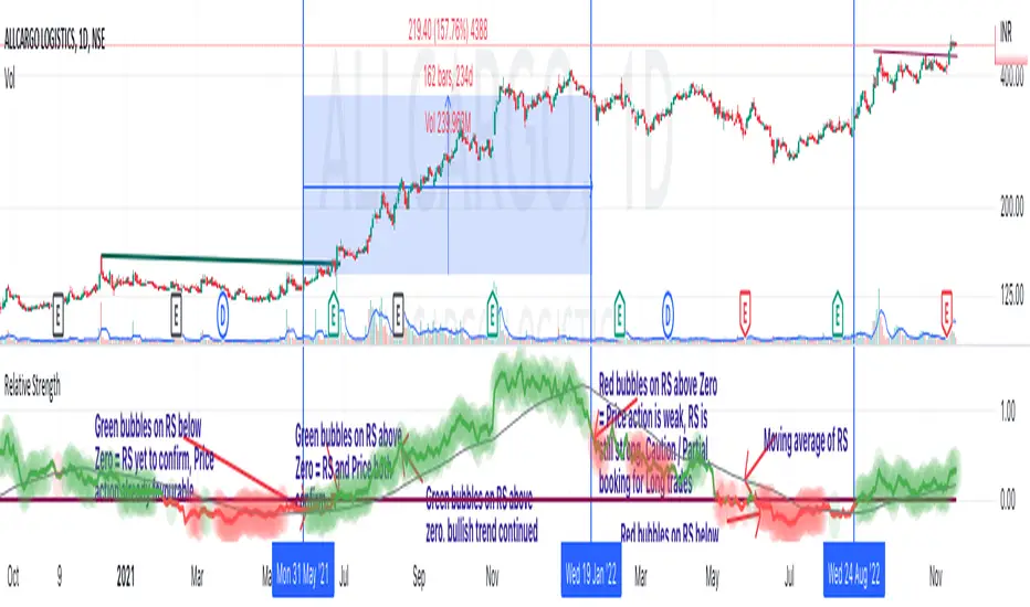 RS is above zero and we have Green bubbles ==> Bullish trend in both price action and RS