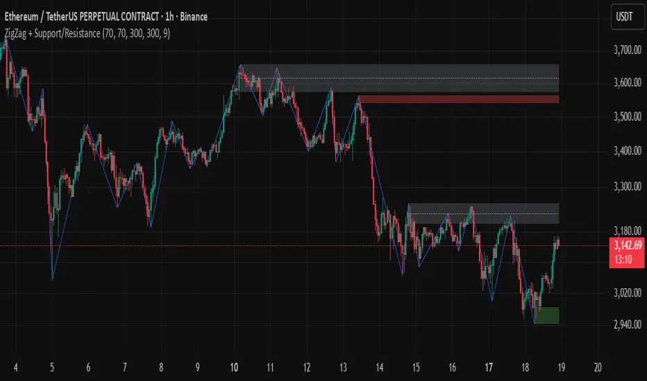 This tool combines a ZigZag swing-detection engine with an automatic Support and Resistance system. Swing highs become resistance zones, swing lows become support zones, and each zone is drawn, merged, extended, or expired according to market activity.