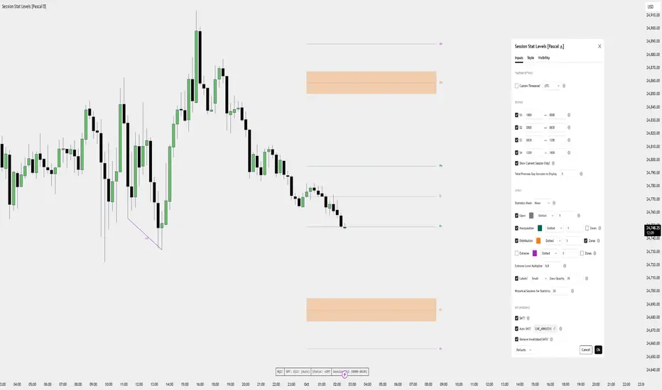 Session Stat Levels plots session-based reference levels (Open, Manipulation, Distribution, Extreme) for up to four custom time blocks (S1–S4), using per-session mean/median stats from recent history. It supports custom timezones, optional SMT divergence marks, alerts, and a compact status table.