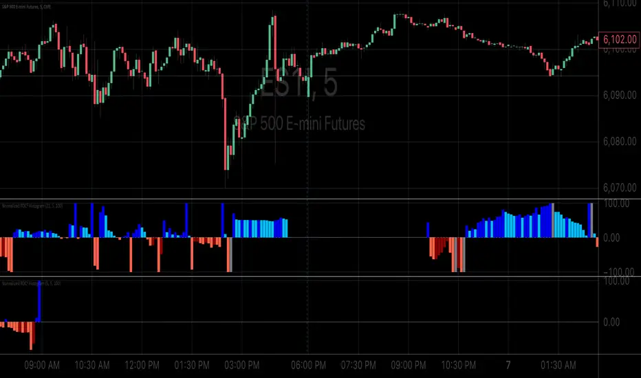 The Normalized ROC² Histogram is a momentum-based indicator designed to detect potential trend reversals by measuring the rate of change of the rate of change of price (the second derivative of price movement). This provides insight into when momentum is slowing down, signaling that a price reversal may be approaching.