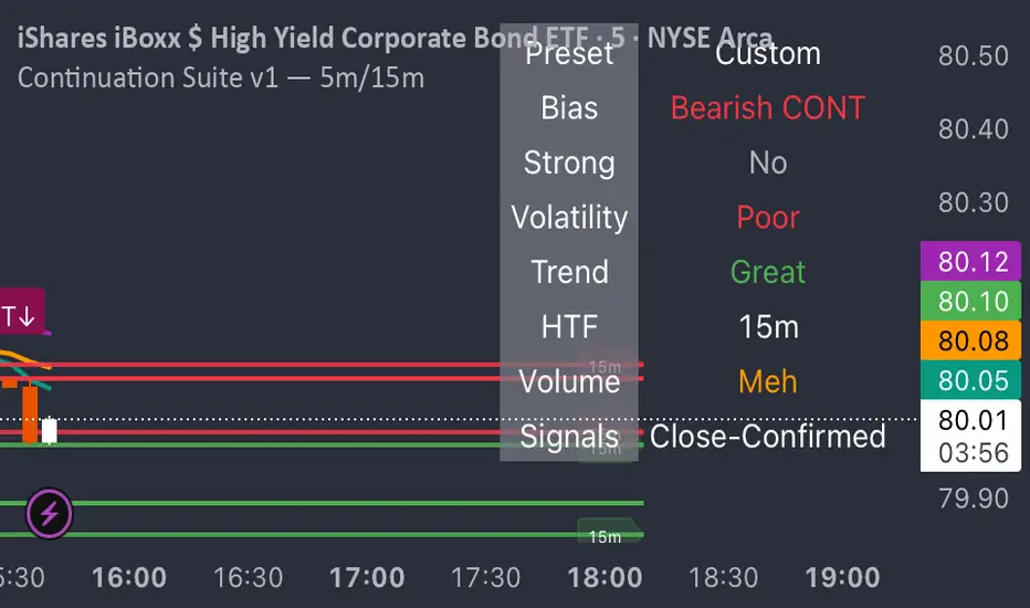 Continuation Suite v1 is a practical intraday toolkit that combines non-repainting trend-continuation signals with auto-built Support/Resistance (S/R) from confirmed pivots. It’s designed for fast, liquid names on 5m charts with an optional 15m higher-timeframe (HTF) overlay. You get: stacked-EMA bias, disciplined pullback+reclaim entries, optional volume/volatility gates, a “Strong” signal tier, solid S/R lines or zones, and a compact dashboard for fast reads.
