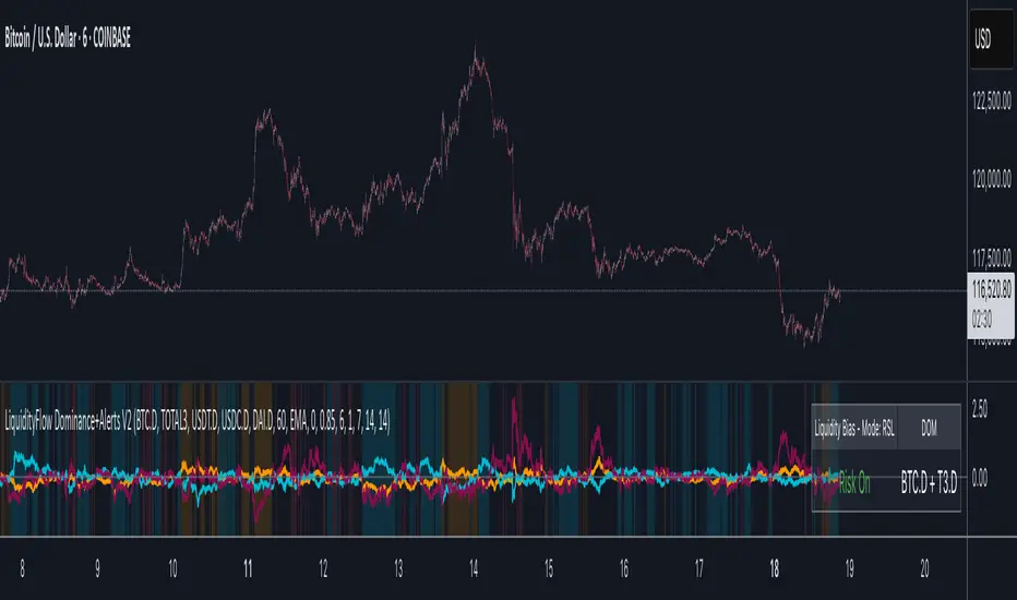 The LiquidityFlow Dominance+Alerts V2 indicator provides a dynamic view of liquidity flows across Bitcoin, Altcoins, and Stablecoins, designed to detect money shifts, track market sentiment, and anticipate regime changes.