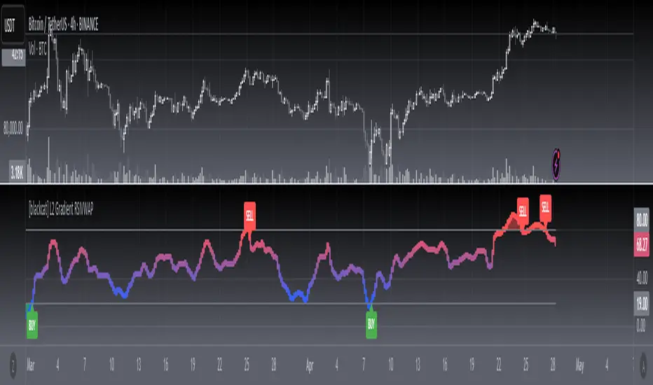 OVERVIEW📈 [blackcat] L2 Gradient RSIVWAP is an innovative TradingView indicator that combines Relative Strength Index (RSI) calculations with Volume Weighted Average Price (VWAP). This script provides a unique perspective on market sentiment by applying RSI to VWAP, offering traders a powerful tool for identifying potential reversal points.