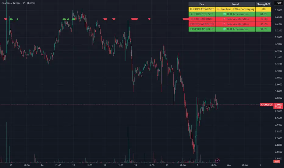 Checks whether your coin trends *with* Bitcoin by evaluating three pairs—**COIN/USDT**, **BTC/USDT**, **COIN/BTC**—on a chosen signal timeframe. Each pair is classified by fast/slow EMA structure **and** slope, shown in a compact table with a **Trend** label and a **Strength %** index. Alerts fire when all three pairs align (optionally only when they’re strong).