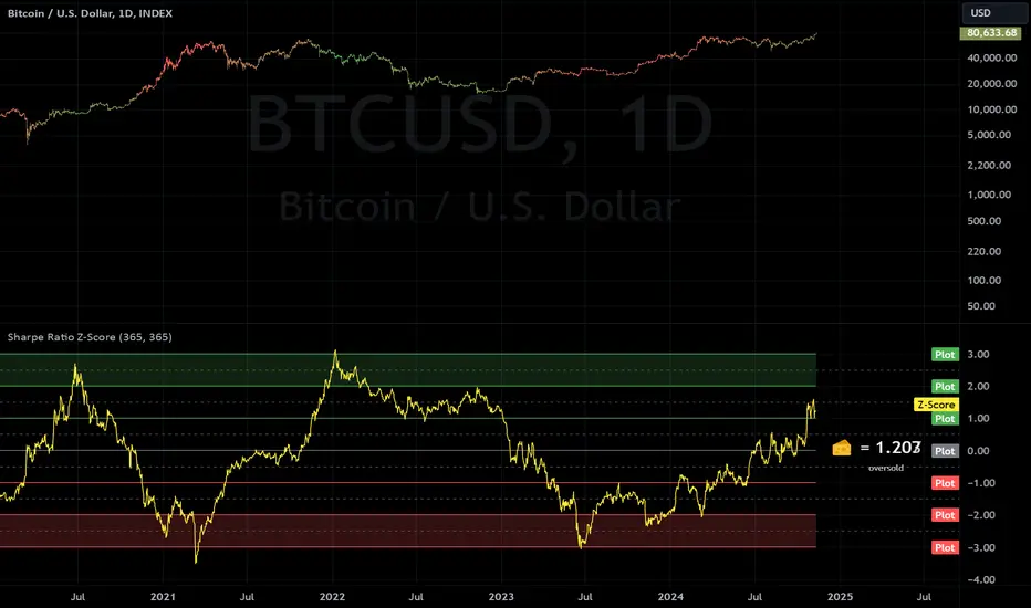This indicator calculates the Sharpe Ratio and its Z-Score, which are used to evaluate the risk-adjusted return of an asset over a given period. The Sharpe Ratio is computed using the average return and the standard deviation of returns, while the Z-Score standardizes this ratio to assess how far the current Sharpe Ratio deviates from its historical average.