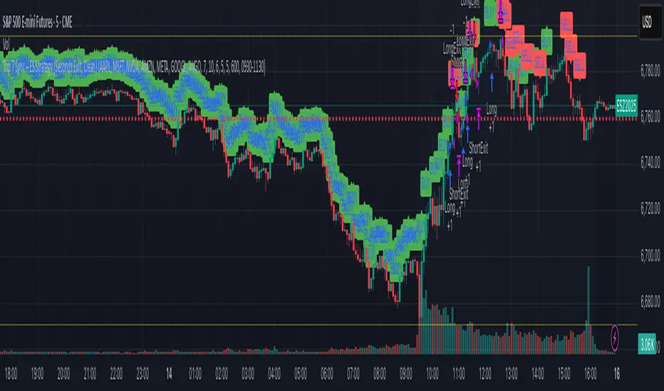 This is a multi-symbol synchronization strategy that trades the ES (S&P 500 E-mini futures) based on the direction of multiple large-cap stocks.