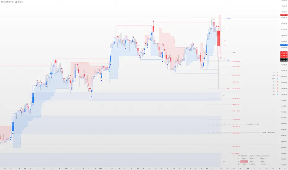 Основные таймфреймы: Автоматически определяются на основе текущего графика и включают месяц, неделю, день, 4 часа и час. Эти таймфреймы выбраны для охвата долгосрочных и среднесрочных трендов, обеспечивая контекст для анализа.