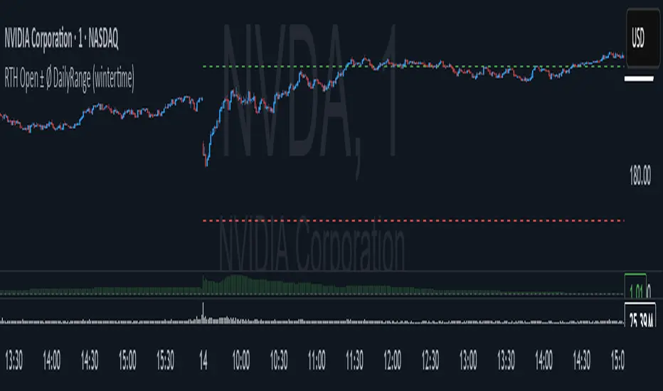 The script draws two horizontal lines on your chart based on the RTH Open (Regular Trading Hours start at 09:00 CET, winter time). These lines are offset by the average daily range (the average of the last 10 days’ high–low range). The lines begin at the first bar of the RTH session and extend dynamically to the current bar.
