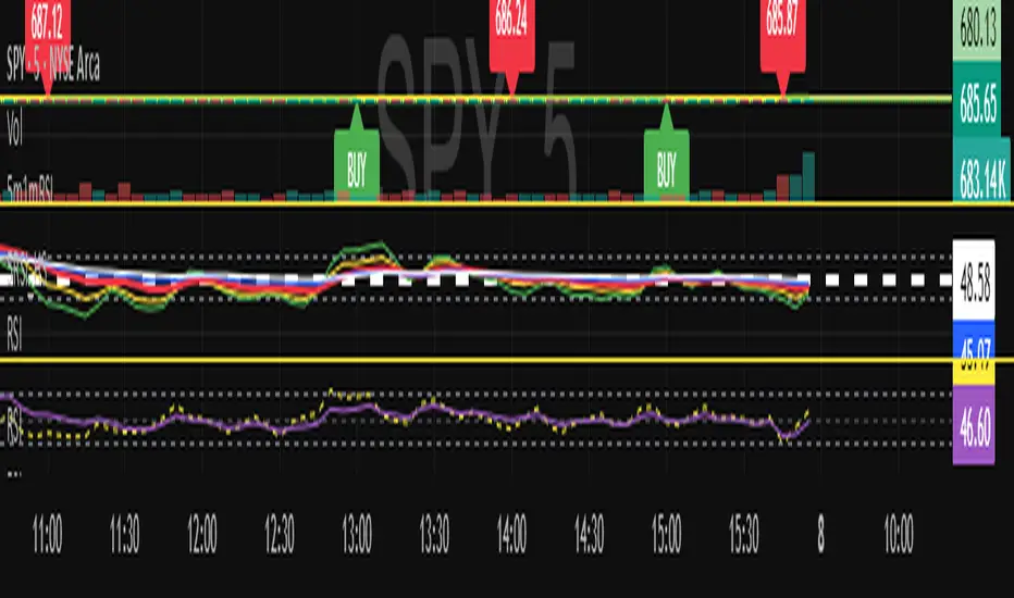 Best used on the 5 min chart, this indicator detects early intraday momentum reversals that occur within an alread-bullish trend using (source = high) RSI lengths 5, 8, 13, 21, & 34. This is primarily designed to catch the moment an uptrend resumes after a dip.