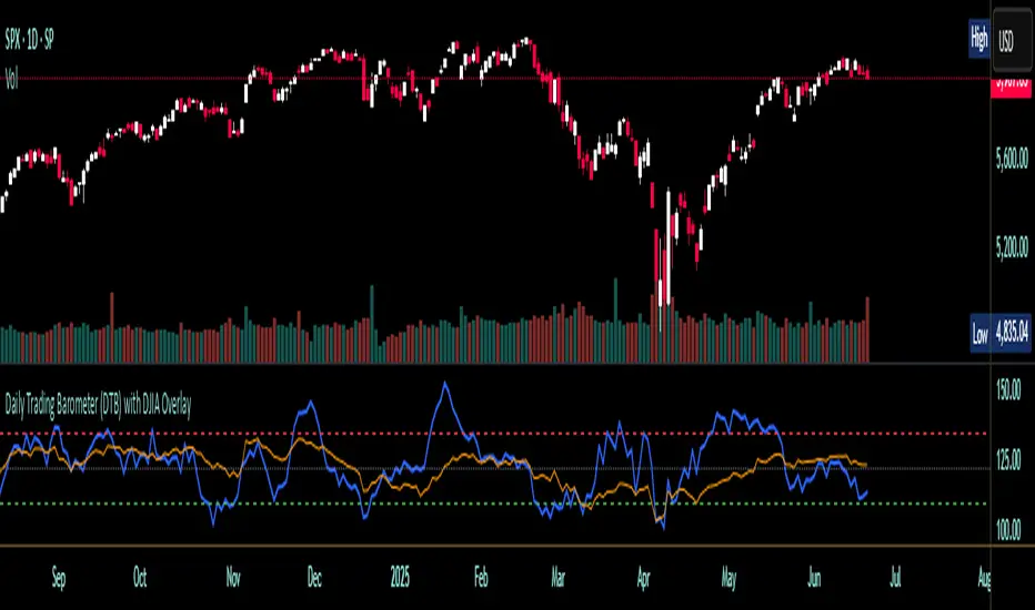 The "Daily Trading Barometer (DTB) with DJIA Overlay" is a custom technical indicator designed to identify intermediate-term overbought and oversold conditions in the stock market, inspired by Edson Gould's original DTB methodology. This indicator combines three key components: