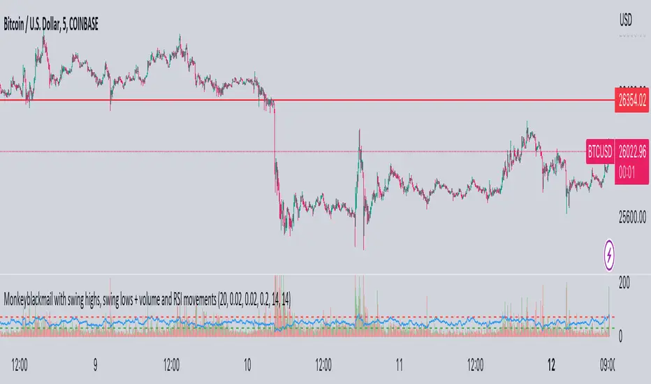 The monkeyblackmail script works well in the 5 minutes chart and combines several elements of technical analysis, including volume analysis, momentum indicators, trend-following indicators, volatility channels, and Fibonacci retracements. It aims to provide a comprehensive view of the market condition, highlighting key levels and potential trends in an easily understandable format. Don’t be too quick to start trading with it, first study how it work and you will blackmail the market.