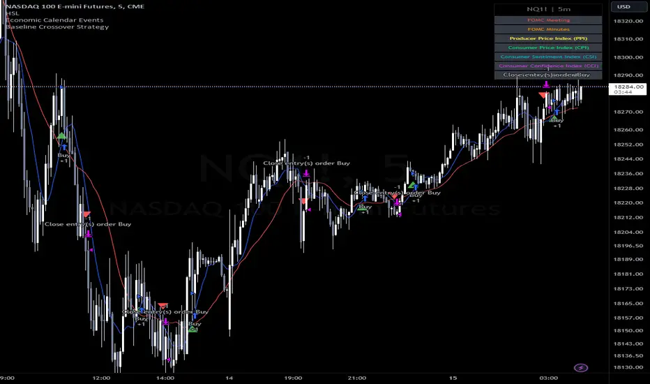 Volatility: If price crosses the baseline, we check to see how far it has moved in terms of multiples of volatility denoted in price (ATR x multiple). If price has moved by at least "Qualifier multiplier" and less than "Range Multiplier", then the strategy enters a trade. This range is shown on the chart with yellow area that tracks price above/blow the baseline. Also, see the dots at the top of the chart. If the dots are green, then price passes the volatility test for a long. If the dots are red, then price passes the volatility test for a short.