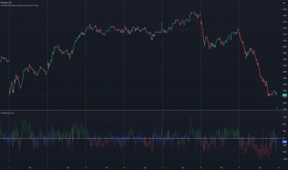 Der TICK Indikator misst in Echtzeit die Anzahl der Aktien, die an der New York Stock Exchange (NYSE) steigen, minus der Anzahl der fallenden Aktien. Der Indikator kann im "Normal"-Modus den aktuellen TICK-Wert anzeigen oder im "Cumulative"-Modus die kumulierten TICK-Werte über den Tag hinweg summieren. Positive Werte deuten auf eine allgemeine Markstärke hin, während negative Werte Schwäche signalisieren. Farbige Balken visualisieren die Dynamik: grüne Töne bei steigenden, rote bei fallenden Werten. Die Nullinie dient als Referenzpunkt zwischen Kauf- und Verkaufsdruck.