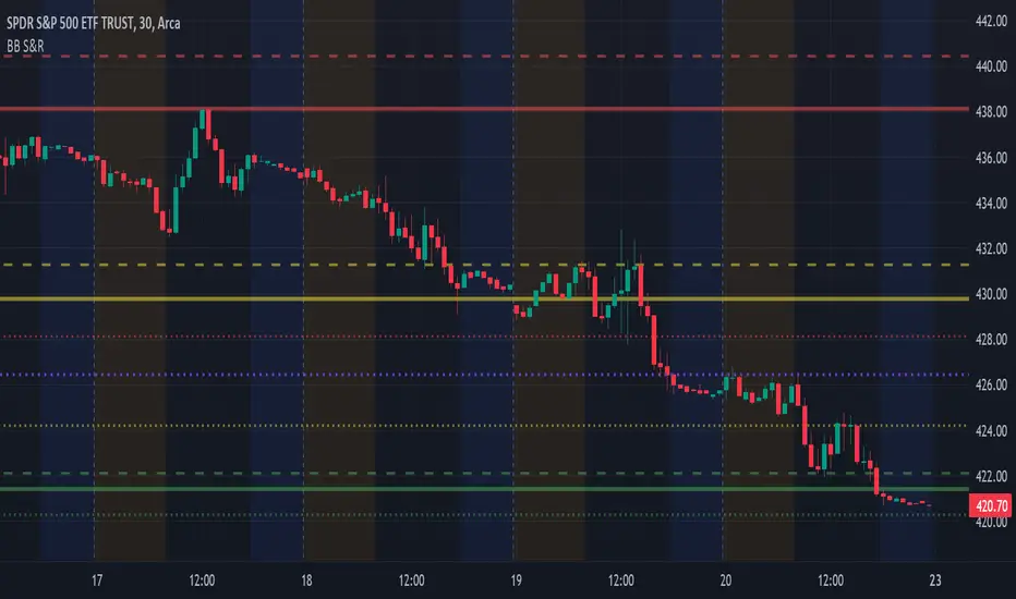 Choosing support and resistance can be time consuming and subjective. Personally, I don't want to spend too much time manually marking up charts. Credit to video I saw, forget the producer, that demonstrated how multi-time frame Bollinger Bands can act as support and resistance. I suggest reading up on Bollinger Bands (en.wikipedia.org/wiki/Bollinger Bands) and how to use them in your trading. This indicator draws support and resistance lines based on Bollinger Bands on three time frames. You can select 1 or all three time frames to display on your chart. Enjoy.Updated...Added option to set S&R line colors by time frame.
