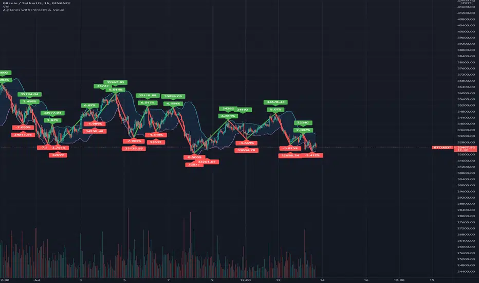 The Zig Lines with Percent & Value is an indicator that highlights the highest and lowest points of the market from pivot points and zigzag lines based on the ZigZag Period setting. By a default value of 13 for the ZigZag Period this works well on Bitcoin or other alt coins on the 1 hour or higher timeframe charts.