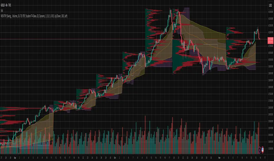 This is the Market Structure Volume Time Velocity Profile (MSVTVP). It combines event-based profiling with advanced metrics like Time and Velocity (Flow Rate). Instead of fixed time periods, profiles are anchored to critical market events (Swings, Structure Breaks, Delta Breaks), giving you a precise view of value development during specific market phases.