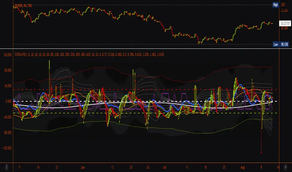 New concept(I think atleast) I've joined the Standard RSI and CCI at the hip with another plotcandle, which gives a picture of a larger candle With more interesting movement imo. Includes Fib Retracement Levels, High/Low and a couple of coppock curves for more confirmation. Broadening candles seem to indicate a weakening of trend strength (from what i've seen atleast) although exceptions do occur. Vice versa for tapering to a lesser degree I imagine. RSI has been shifted down to 0 to align the center point with the CCI , so the usual 30/70 RSI Levels are now -20/20 (although I have 30/-30 instead for the hlines).