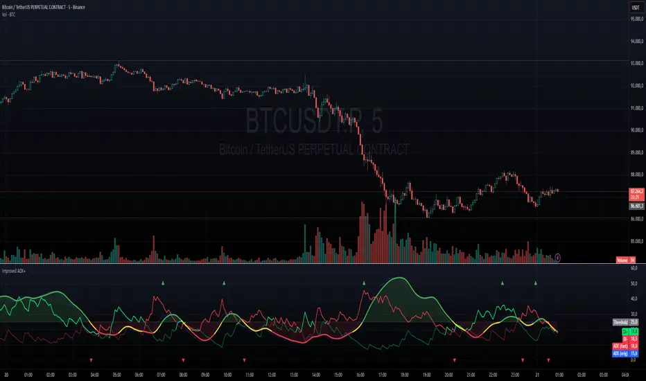 This indicator is a custom implementation of the Average Directional Index (ADX), designed to provide a responsive and visual representation of trend strength along with the DI+ and DI– lines. It uses manual calculations for the ADX and directional movement components for greater control over smoothing and responsiveness.