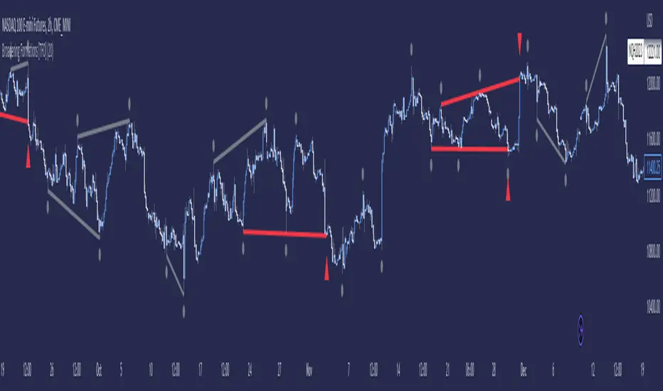 This indicator highlights deviations from broadening formations (or megaphone patterns). Deviations from broadening ranges can often foreshadow reversals, especially in consolidation phases. These deviations are highlighted via trendlines that change color when tested, and also have the option to be alerted.