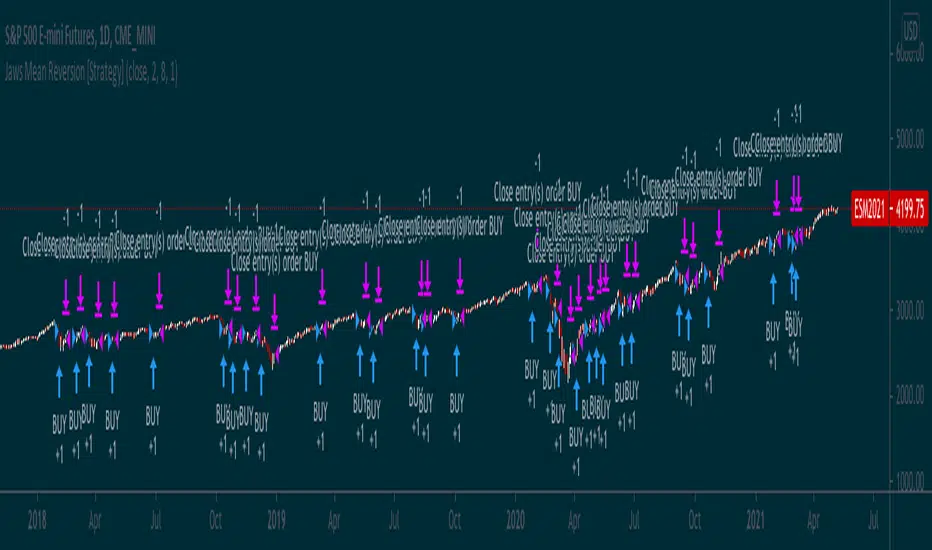This very simple strategy is an implementation of PJ Sutherlands' Jaws Mean reversion algorithm. It simply buys when a small moving average period (e.g. 2) is below