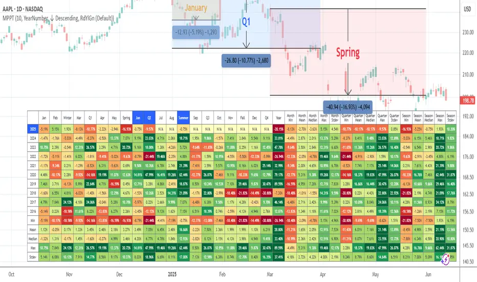 - The script analyzes your selected number of years of price data, calculating returns for each month, quarter, and season