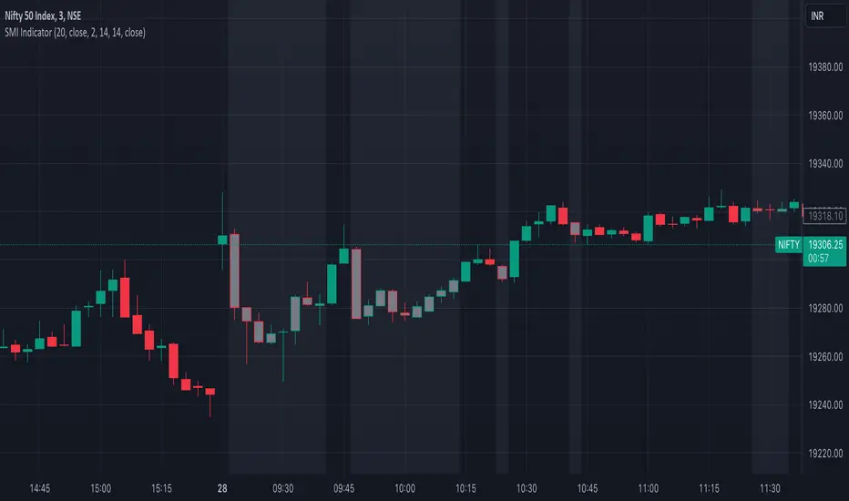 The Sideways Market Identifier (SMI Indicator) aims to identify when the market is trading in a sideways pattern. This is particularly useful for traders who specialize in range-bound strategies or those looking to avoid trading in choppy market conditions. The indicator changes the background and the color of the candles to grey when the conditions for a sideways market are met.
