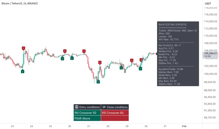 A table at the bottom of the chart lists all active entry/exit indicators. Upon each closed trade, an integrated statistics label displays net profit, total trades, win/loss count, average and median PnL, etc.