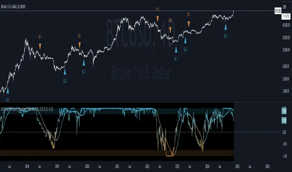 The M2 Suite aggregates global M2 money supply data, normalizing it to USD for comparability. It calculates percentage changes over multiple timeframes (30–360 days) and averages these changes to score the strength and direction of the M2 trend. With customizable smoothing options, users can tailor the indicator to suit their trading style.