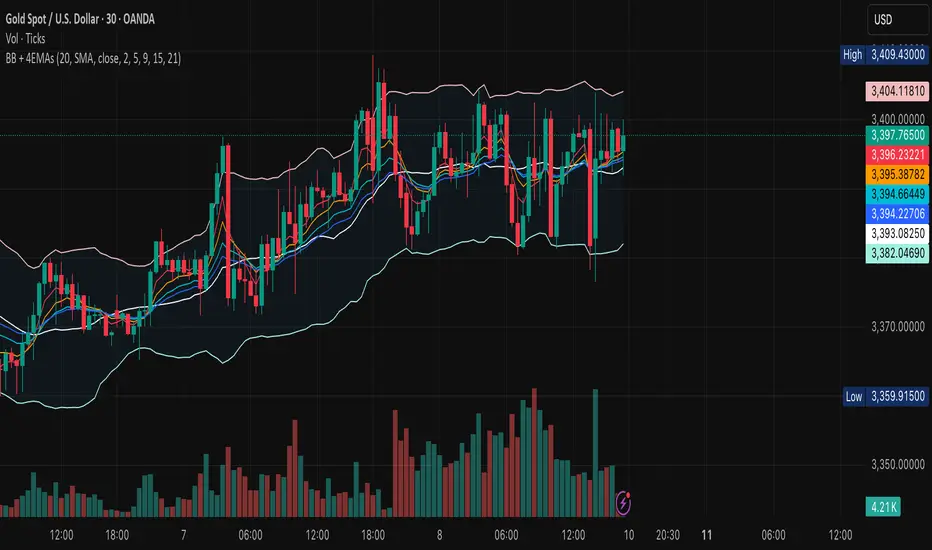 Four Custom EMAs with Bollinger BandsOpen-source script