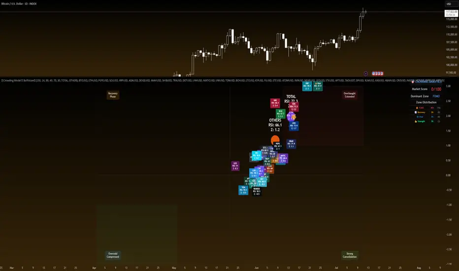 The Crypto Crowding Model Pro is a sophisticated analytical tool designed to visualize and quantify market conditions across multiple cryptocurrencies. By leveraging Relative Strength Index (RSI) and Z-score calculations, this indicator provides traders with an intuitive and detailed snapshot of current crypto market dynamics, highlighting areas of extreme momentum, crowded trades, and potential reversal points.