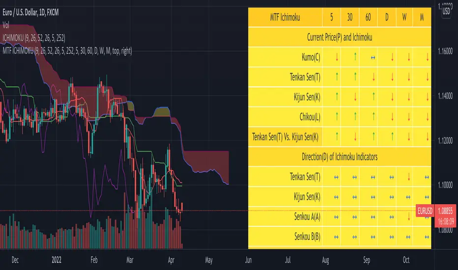 This indicator analyzes six different timeframes with Ichimoku in depth. Default timeframes are 5M, 30M, 60M, D, W, and M. You can change the default timeframes from the setting.