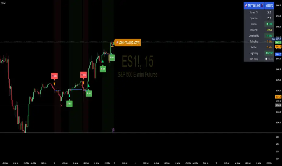 It plots buy/sell markers from a TSI cross with momentum confirmation and, if enabled, draws a trailing stop line that “ratchets” in your favor. It also shows a compact info table (position state, entry price, trailing status, and unrealized ticks).