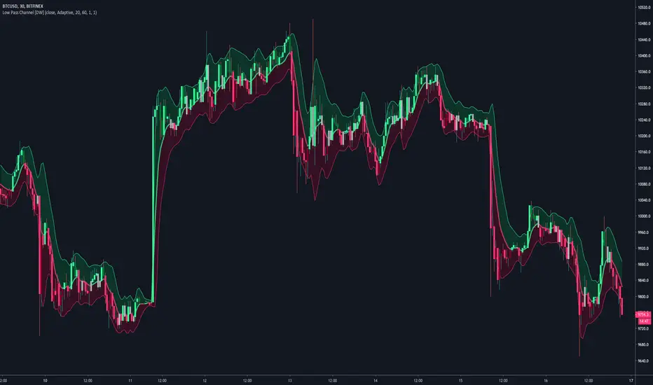 To generate the channel, the same filter approach is applied to true range then added to and subtracted from the price filter.