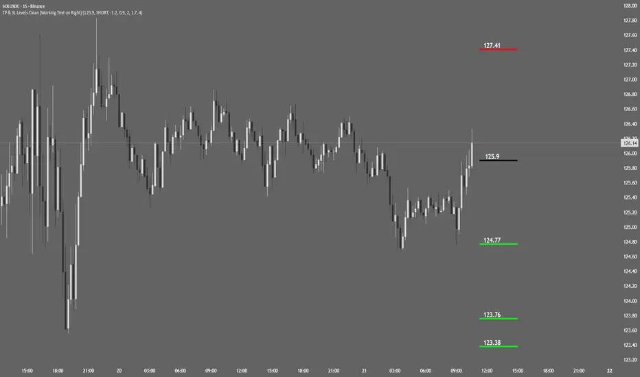 TP & SL Levels Clean is a precision trade-management tool designed to instantly plot professional-grade Take Profit and Stop Loss levels directly on your chart. Whether you are scalping, swing trading, or managing high-risk execution, this indicator removes guesswork by automatically calculating your SL and up to three configurable TP targets, displaying them with clean price labels on the right side of the chart.