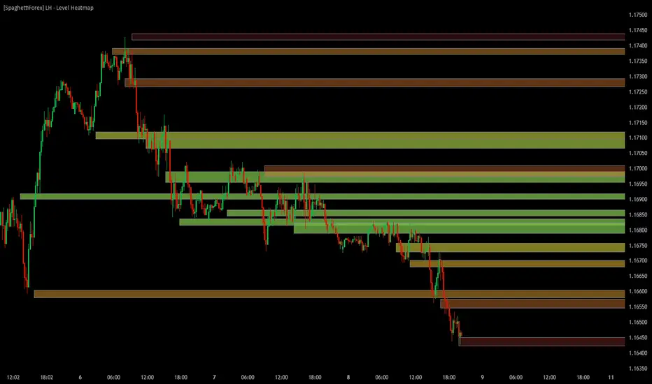 LH — Level Heatmap is a context tool that builds a dynamic heatmap of price zones (support/resistance areas) and assigns each zone a strength score (0–100) based on how price interacts with it over time.