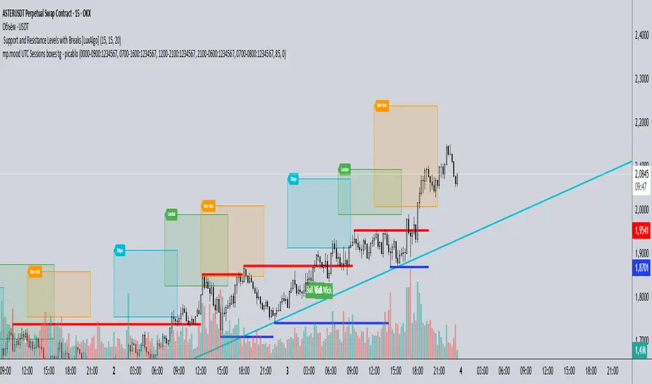 UTC Sessions — прямокутники за сесіями. Малює лаконічні прозорі квадрати для сесій Tokyo, London, New York, Sydney та Frankfurt у UTC. Кожен квадрат охоплює час сесії та автоматично підлаштовує вертикальні межі під тіні свічок (high/low) поточного таймфрейму. Підпис у верхньому лівому куті. Кольори, прозорість і набір сесій налаштовуються.