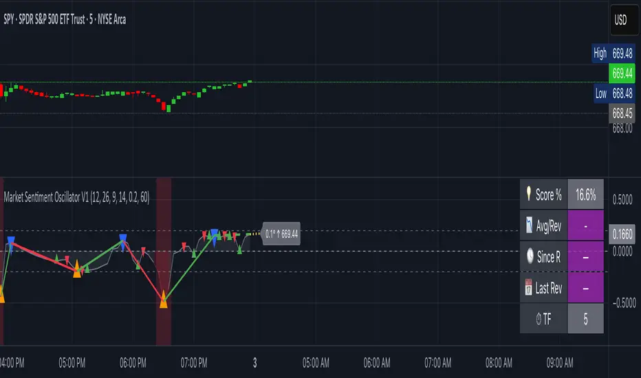 The Market Sentiment Oscillator is a Pine Script v6 indicator for TradingView that assesses market context with a composite oscillator. It blends MACD, RSI, and Volume Price Trend (VPT) into a normalized score, with optional multi-timeframe (MTF) averaging and optional trail lines to visualize recent extremes. Weighting and normalization are used to keep the scale consistent across symbols and timeframes. A compact status table summarizes sentiment, trend, and turning-point markers.