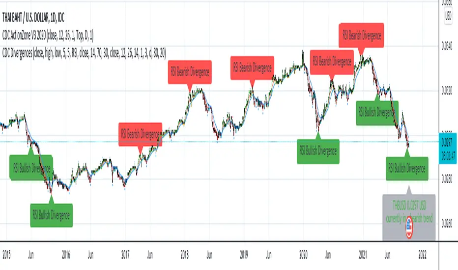 The divergences are shown with labels, user can change the momentum/volume indicator used to identify divergences in the settings.