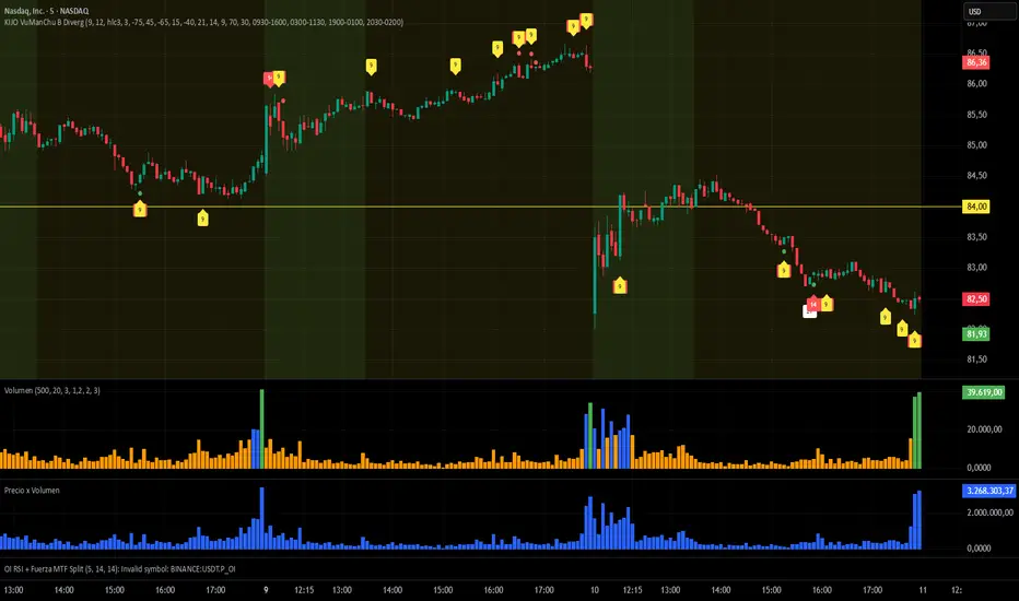 Descripción en Español: Herramienta integral que combina divergencias WaveTrend, señales de triple RSI y visualización de sesiones de mercado (NY, Londres, Tokio, Shanghái).