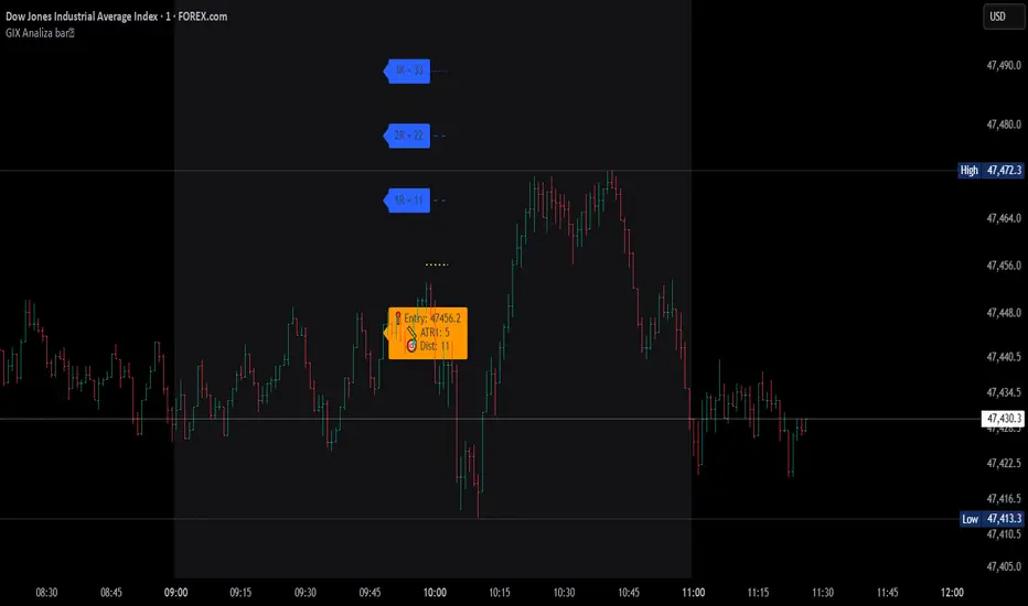 This indicator is called "GIX Bar Analysis" and it works simply: you add it to the chart, then click on the candle you want to analyze. After clicking, a black square appears that you can drag to move the analysis to another bar. Basically, if you want to change the analyzed bar, just drag the black square to the new desired bar.