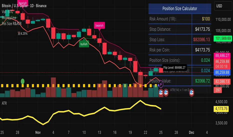 Professional position sizing tool for crypto traders using risk management principles and ATR-based stop loss placement.