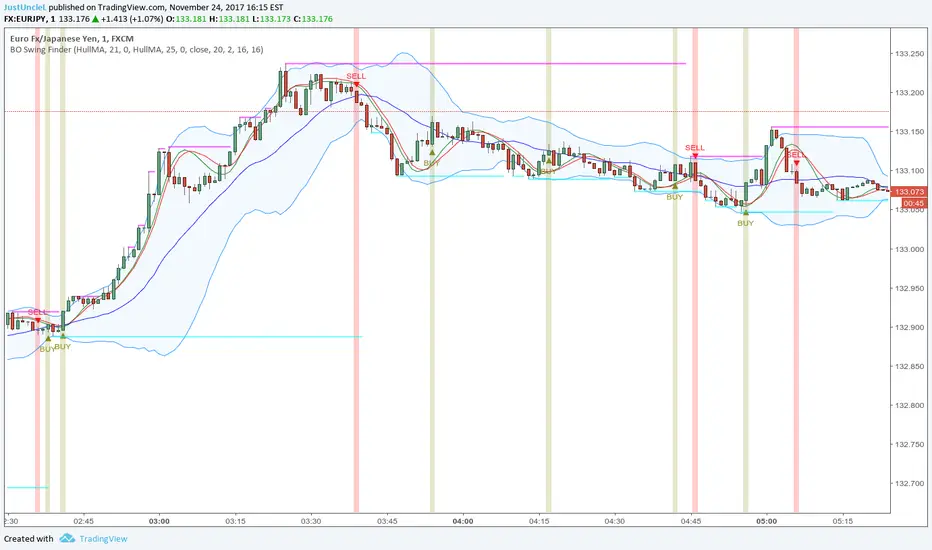 The optional HullMA (any any other MA pair) are used to confirm the swing direction. The indicator also plots the two KitKat Support and Resistance lines with optional High/Low labelling on KitKat1 lines.