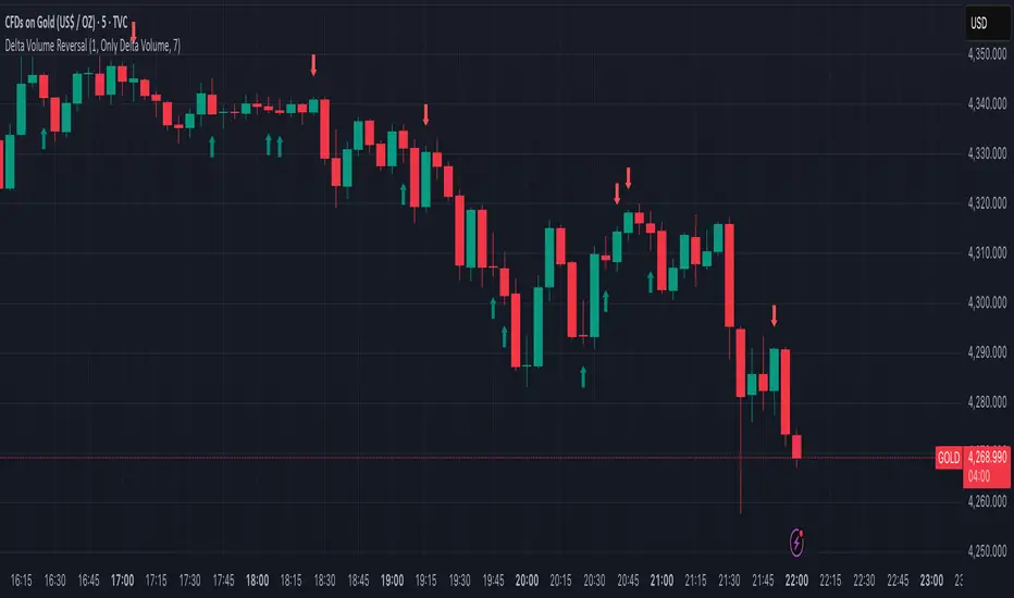 This script displays Delta Volume-based reversal arrows by analyzing buying vs. selling volume from a lower timeframe. An up arrow appears when a red candle closes with dominant buying volume (bullish delta), while a down arrow appears on green candles with dominant selling volume (bearish delta). This highlights potential hidden strength or weakness in price action.