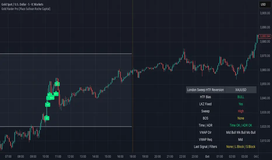 BUY: Wait for low sweep of LKZ → BOS up → dashboard shows BULL bias, Time/ADR OK, VWAP pass. Enter on the next pullback or at close; SL below BOS invalidation (or fixed 0.5–0.8× ADR14 of XAU).