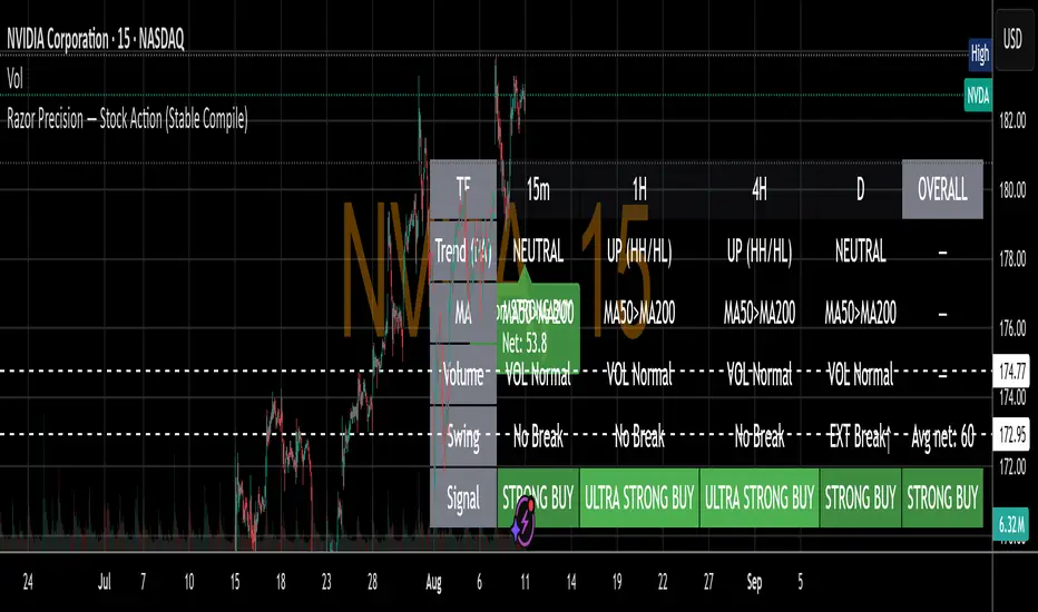 The Razor Precision indicator is an advanced, multi-layered market analysis tool designed for traders who demand accuracy and alignment across multiple timeframes. It combines price action, moving average crossovers, volume confirmation, swing structure mapping, and indicator confluence (RSI, MACD, ATR, OBV) to generate actionable buy/sell strength ratings.
