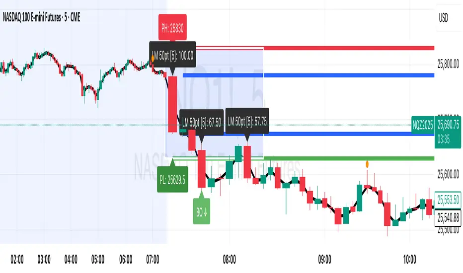 This comprehensive Pine Script indicator is designed for **futures traders** (ES, NQ, GC, CL, etc.) who trade breakouts, retests, and reversals based on pre-market and opening range levels. The indicator automatically identifies key price levels, tracks breakout patterns, detects failed retests, and alerts you to significant price moves—all while providing clear visual reference lines throughout the trading session.